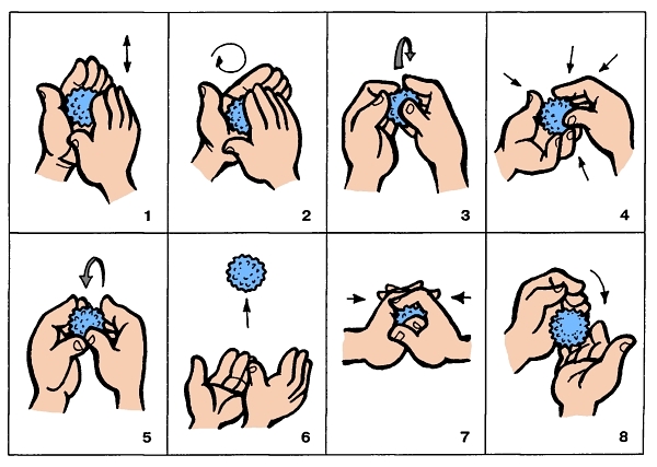 7. Stlačování míčku mezi dlaněmi s "propletenými" prsty.