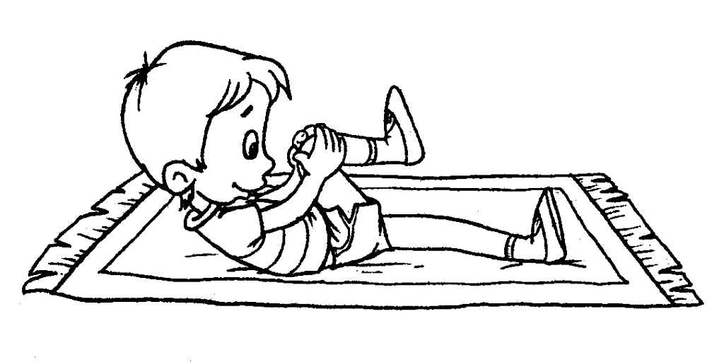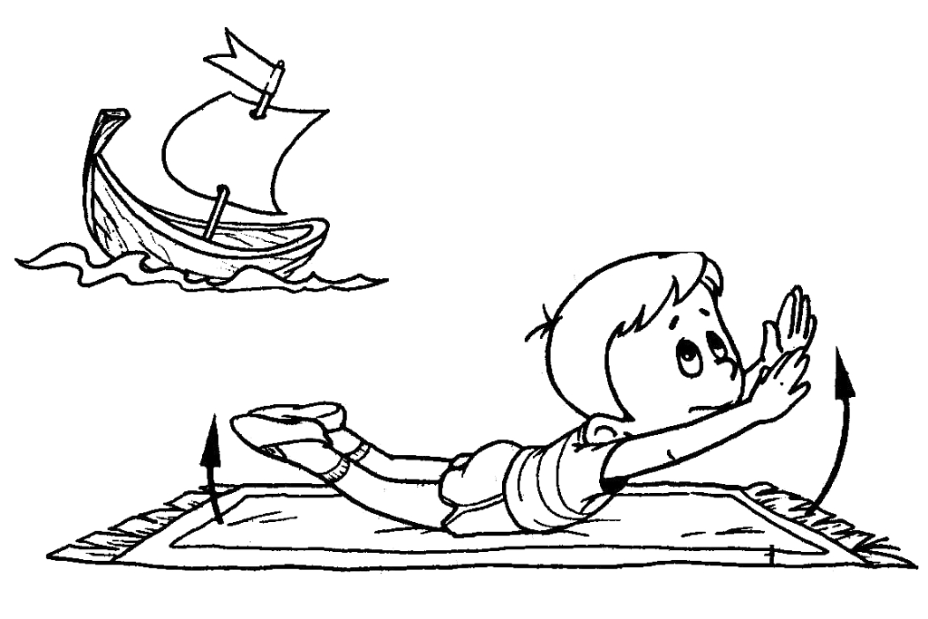 1. Letadlo. Dítě leží na břiše s nohama u sebe, zdvihne hlavu a horní část trupu a rozpaží. Aniž by ohýbalo lokty, naklání se ze strany na stranu jako opravdové letadlo.