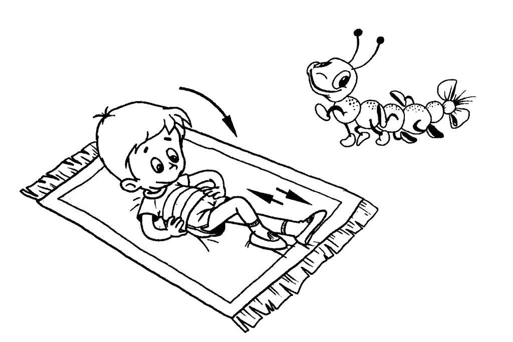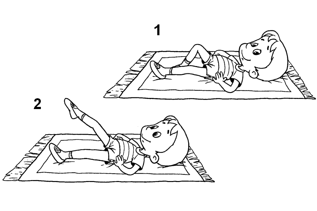 12. Přitahování kolena. Dítě leží na zádech, zdvihne hlavu a horní část trupu, pokrčí jednu nohu a oběma rukama si přitáhne koleno směrem k bradě, poté nohu opět natáhne. Totéž pak udělá s druhou nohou.