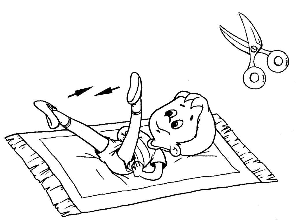 8. Nůžky. Dítě leží na zádech s rukama v bok. Nataženýma nohama "stříhá" ve vzduchu jako nůžkami.